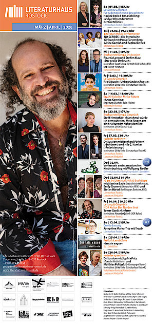 * Mitglieder im Literaturhaus Rostock e.V. erhalten unser gedrucktes Programm auf Wunsch auch per Post (und natürlich ermäßigten Eintritt zu den meisten Veranstaltungen des Literaturhauses). Bei Interesse hier entlang.